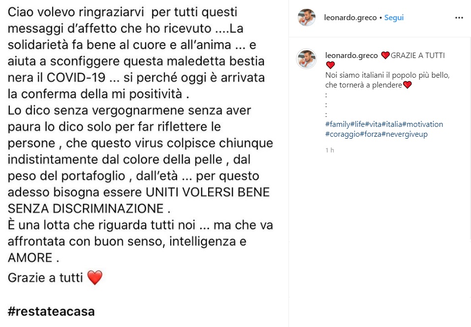 Risale alle ultime ore la notizia di un ex tronista del noto programma Uomini e Donne positivo al Coronavirus: si tratta di Leonardo Greco, tronista nel 2010-11, che lo ha annunciato lui stesso sul suo profilo Instagram tramite un post, leggibile qui in basso.